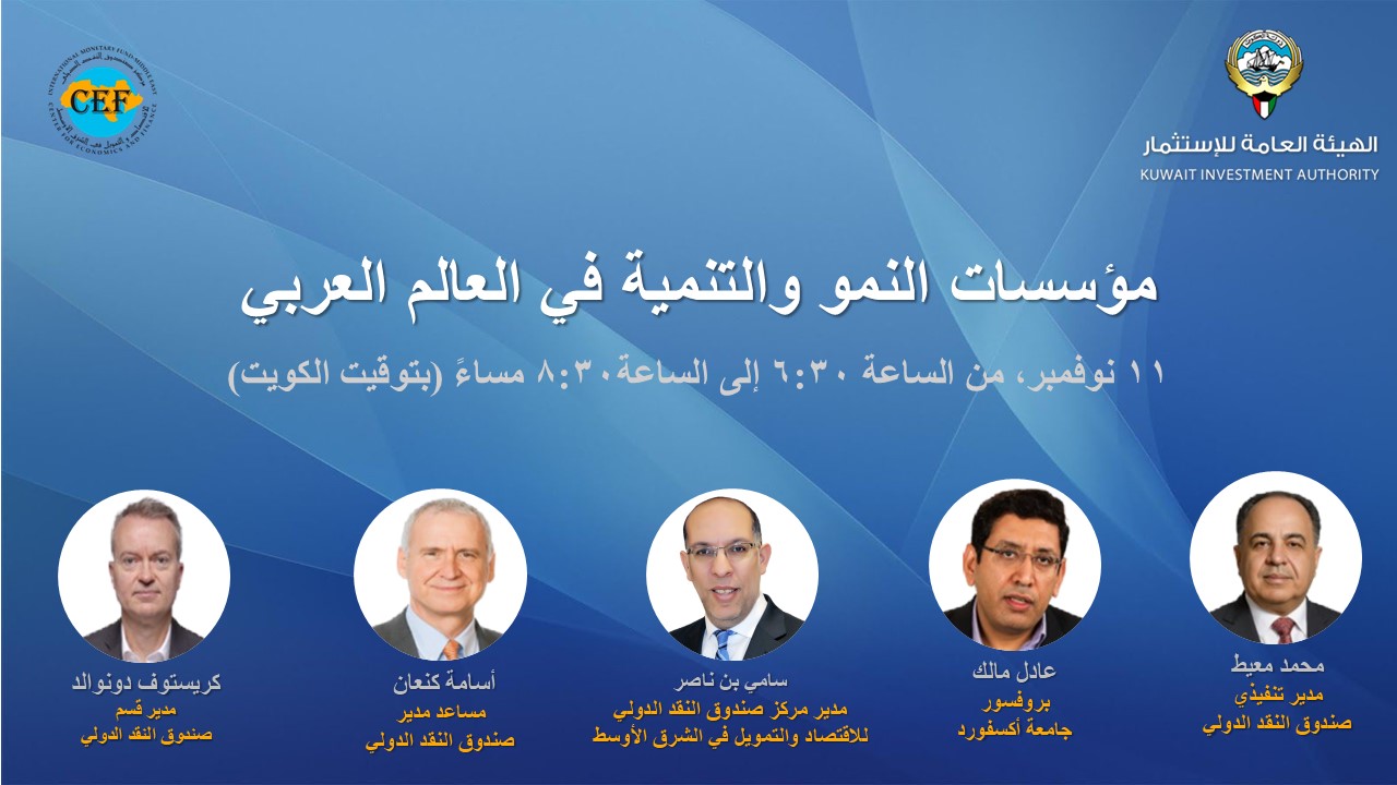 نظم مركز صندوق النقد الدولي للاقتصاد والتمويل في الشرق الأوسط بالتعاون مع هيئة الاستثمار الكويتية (KIA)، حدثًا رفيع المستوى بعنوان "المؤسسات من أجل النمو والتنمية في العالم العربي". وقد جمعت هذه الندوة، التي نُظمت بصيغة هجينة، نخبة من المتحدثين وجمهوراً متنوعاً ضمّ كبار صانعي السياسات وممثلين عن القطاعين العام والخاص، ومنظمات المجتمع المدني، والمؤسسات الدولية والإقليمية، ووسائل الإعلام، والسلك الدبلوماسي.