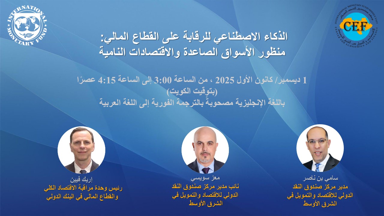 نظّم مركز صندوق النقد الدولي للاقتصاد والتمويل في الشرق الأوسط (IMF-CEF) بالتعاون مع البنك الدولي (WB) ندوةً عبر الإنترنت بعنوان "الذكاء الاصطناعي للرقابة على القطاع المالي: منظور الأسواق الصاعدة والاقتصادات النامية" يوم الاثنين الموافق 1 ديسمبر/ كانون الأول 2025. وألقى السيد معز سويسي، نائب مدير المركز، الكلمة الافتتاحية كما واهتم بإدارة الجلسة. من جهته، قدم السيد إريك فيين، رئيس وحدة مراقبة الاقتصاد الكلي والقطاع المالي في البنك الدولي وكبير الاقتصاديين المعنيين بالقطاع المالي، لمحةً عامةً عن اعتماد الذكاء الاصطناعي في الرقابة على القطاع المالي في الأسواق الصاعدة والاقتصادات النامية. وسلّط الخبير الضوء في عرضه على القضايا العملية الرئيسية والتحديات والمخاطر التي تواجه الأسواق الصاعدة والاقتصادات النامية، وبحث في كيفية بدء السلطات المالية في تحديد ومتابعة المخاطر المتعلقة باستخدام الذكاء الاصطناعي في مجال حماية المستهلك المالي ورصد سلوكيات الأسواق.