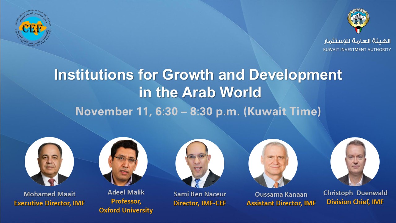 It is our pleasure to invite you to attend the event “Institutions for Growth and Development in the Arab World” jointly organized by the IMF Middle East Center for Economics and Finance (CEF) and the Kuwait Investment Authority (KIA). Please join us at the Kuwait Investment Authority Headquarters in Kuwait City on November 11, 2025, from 6:30 p.m. to 8:30 p.m. We recommend that you arrive at the venue 30 minutes before the start time to complete registration and get seated.