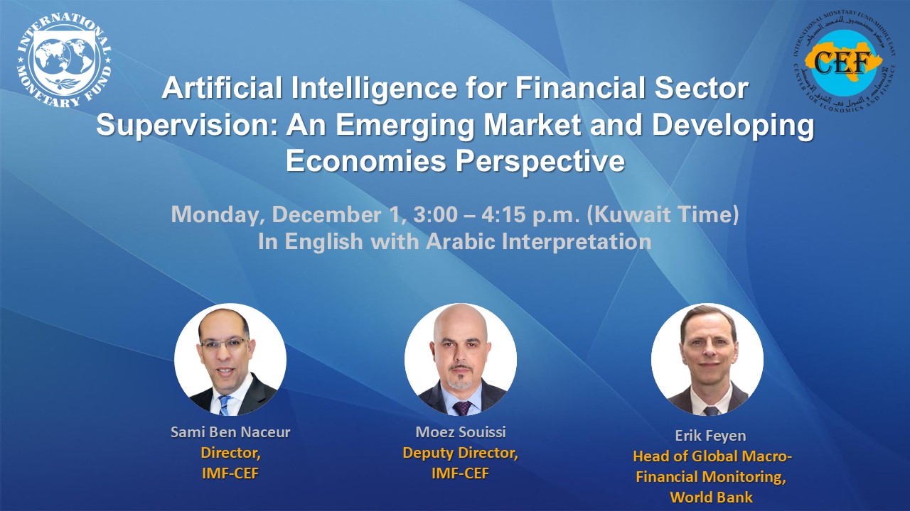 The International Monetary Fund–Middle East Center for Economics and Finance (IMF-CEF) and the World Bank (WB) hosted a webinar titled “Artificial Intelligence for Financial Sector Supervision: An Emerging Market and Developing Economies Perspective ” on Monday, December 1, 2025. Mr. Moez Souissi, Deputy Director of the CEF, delivered the opening remarks and moderated the session. Mr. Erik Feyen, WB Head of Global Macro-Financial Monitoring and Lead Financial Sector Economist, presented an overview the state of AI adoption in financial sector supervision by Emerging Markets and Developing Economies (EMDE). The presentation highlighted the associated practical issues, challenges, and risks EMDE face. He also discussed how financial authorities are beginning to identify and monitor AI-related risks in financial consumer protection and market conduct .